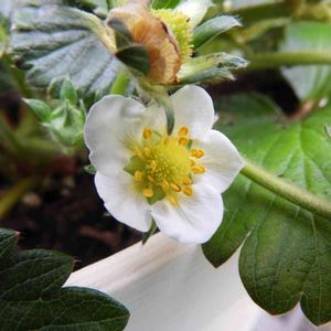 八株のうち二株に、ちいさな花ができました いちごって、春の収穫だとおもってたけど… これは結実しないのかな?? 何はともあれほっといても元気に育ってます♪