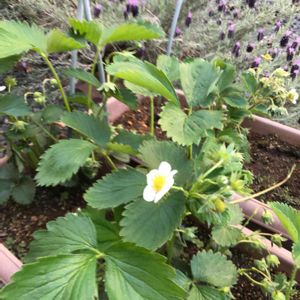 ラベンダーに蜜蜂が来ていたので 苺の花を側に置いてみました🍓