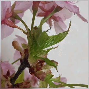 玄関のサクラ、満開をやや過ぎて、葉が伸びてきました。その黄緑が何とも美しくて、パシャリしました✨