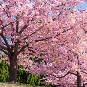 河津桜(カワヅザクラ) バラ科サクラ属の落葉小高木。寒緋桜(カンヒザクラ)と大島桜(オオシマザクラ)の自然雑種といわれ、染井吉野(ソメイヨシノ)より色の濃い花を葉が開く前に咲かせる。原木は野生の状態で発見された。1955年2月に静岡県の伊豆半島南部、河津町の飯田勝美さんが冬枯れの雑草の中で芽吹いている高さ1mの幼木を見つけた。その後、増殖され近年急速に普及した。花期は2~3月。花は直径3㎝、丸みのある花弁の先端に切れ込みがあり、縁のほうが色が濃い。 サクラはバラ科サクラ属の中の一群である。サクラ属は花木のサクラのほか、ウメやモモ、アンズ、アーモンドなども含む大きなグループである。花木のサクラは400種類以上ともいわれる。日本にもともと自生していた天然種のほかに、人工交配や変異により生じた園芸品種が数多くある。天然種には、ヤマザクラ、オオヤマザクラ、エドヒガン、オオシマザクラなどがある。園芸品種はサトザクラと総称され、その数は数百といわれ、代表はソメイヨシノである。ヤマザクラとソメイヨシノの大きな違いは開花時の葉の出方による。ヤマザクラは葉が出るのと同時に開花し、ソメイヨシノは葉が出る前に花が咲く。 出典『桜の樹木学』『樹に咲く花 離弁花①』『樹木と木材の図鑑』