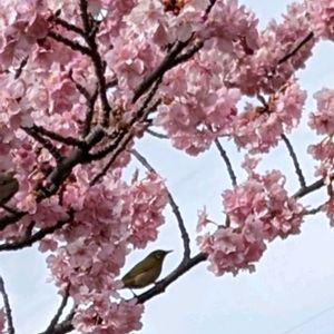 グリーン道路沿いに咲く河津桜ビンクが可愛い桜に可愛いメジロの桜ジローが一休み✌️