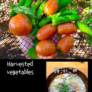 昨日の収穫 お花は前picと同じです。 大根間引き アサツキ ピーマン シシトウ トマト