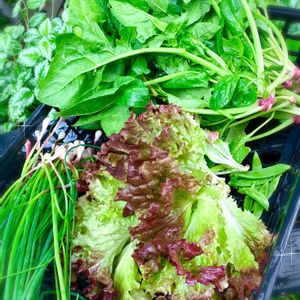 昨日の収穫~❣️ ⚫紫キャベツ(前picで) ⚫トンネルホウレンソウも大きいのからドンドン採ります!取り敢えずコーティング無し種 20株位💕 ⚫サニーレタスも、ドンドン間引き。 同じく20株位 ⚫アサツキ ボーボーしてきたので、ドンドン使いましょう ●写真に無いけどパセリ