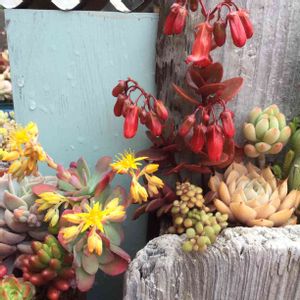 母が作った寄せ植えに花が咲いた!でも名前がわからないのでご存知の方教えてくださいm(_ _)m 追記:みなさんが教えてくださったカランコエで検索したらこれによく似た紅提灯というのがヒットしました。ありがとうございました!!