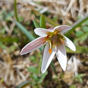 3月19日撮影 赤塚植物園 こちらは野草の道です。 ヒロハノアマナは東京都では絶滅危惧I類に指定されています。 アマナとの違いは葉の幅が広く、中央に白線があるところです。 花茎に3個の苞があることでアマナと区別できる…とWikipediaには書いてありましたが、3個の苞とは、つぼみの下にある、ぷにゅぷにゅした感じに見えるものでしょうか? 苞というのは花を下から支えるようなイメージがあり、花にくっつく近さにあると思っていたのですが、これが苞なのですね。 (アマナは2個なのだそうです。先ほどの写真では分かるように撮っていませんでした🙇) 咲いている場所も違うので比べられないですが、この花はぼーぼー生えているという感じではありませんでした。 ヒロハノアマナ(広葉の甘菜) ユリ科アマナ属