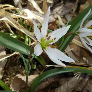 板橋赤塚植物園の散策 🤍広葉甘菜(ヒロハノアマナ)🤍 ユリ科 多年草 茎先に白色の6弁花を一つ咲かせます 葉は幅が広く中央に白い線が入ります 🧚🏻♀️スプリングエフェメラル🧚🏻♀️