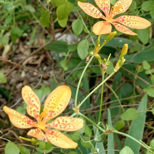 『ヒオウギ』 🏷️ダルマヒオウギ 一輪の ひらく檜扇 雨降る日 君に会う日の しるしのように 雨のしずくをまとった一輪の檜扇よ 君が帰ってきた知らせなの? 精霊花(しょうろうばな)とも呼ばれ お盆に先祖の霊を迎えるお花 ずっと探してやっと出会えた 花が咲くのか心配していたけれど お墓参りの前の日に そっとひらいてくれたのね 濡れた花びらの向こうに 君の笑顔が見える気がして 会いたくて 会いたくて 涙が止まらない母です。