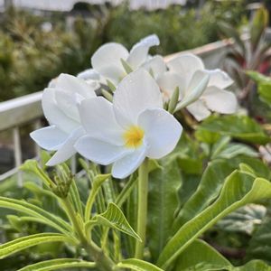 昨年ご近所さんから、いただいたプルメリア。 地植えにしようと決めていたけど、中々場所が決まらず、庭の片隅に土が付いたまま放置してたら、なんと葉っぱは全て落ちて、棒っ切れの様になっちゃって😱(一応プルメリアはそれでも行ける!と、知ってました😁)早く植えなきゃ❗️とは、思ってました。 で、今年の初めに漸く植える場所が決まって、その棒っ切れの様な枝を地植えしました。 そしたらやっぱりさすが南国の花木🌺プルメリア💕 土に挿して水を与えたら、あれよあれよという間に葉が茂り.... 先週辺りから、いよいよ蕾が着いて、一輪😅咲きました。 立派に茂った葉っぱに比べると、メチャ小ちゃい可愛らしい花が咲いてます😅 まぁまぁきっとこれからよね〜😁 頑張れ〜、プルメリアちゃん☺️ 3枚目は古株のセイロンランティア🥰 この子も夏の定番ですが、真っ白で爽やかで、大好きなお花の一つです🥰