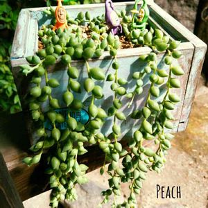 カット✂して初根させたピーチネックレス〜💚 4月始めの頃、木箱に植え付けたのが… やっとムチムチ&タラリ〜ン…୧( ˃◡˂ )୨ GARAMちゃん💕💕 やっと…こびと登場〜⁺‧•͙‧⁺o(⁎˃ᴗ˂⁎)o⁺‧•͙‧⁺