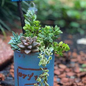 レジ横にあった青い鉢が素敵だったから見たらなんと 200えんΣ(•'╻'• )買うでしょ。 真ん中の4つを植えた後、後半は寄せ植えに使えるし、グランドカバーにもなるでしょと庭に植えてあったセダムをこの時とばかりにズボズボ=3お昼ご飯を作る前にとちょっとやっつけ仕事になってまった(^◇^;)=3グリーンだから前回の鳥かご寄せと似た感じかなぁ🌿