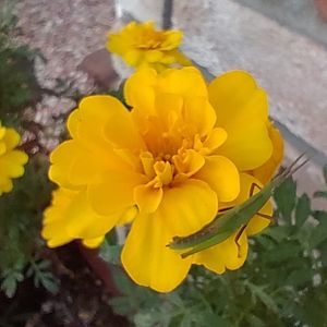 おはようございます☀️ バッタさんがマリーゴールドからごあいさつ😊💛