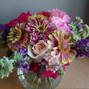 畑の百日草 クィーンレッドライム 薔薇 マイガーデン ブッドレア マウンテンミントなどと一緒に束ねてみました〜🥰