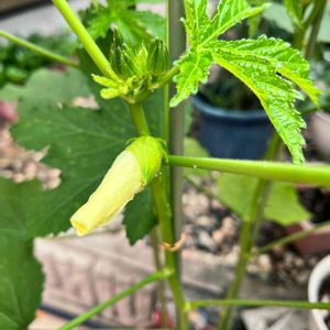我が家の小さな菜園です ピーマン 茄子 オクラ の苗を植えています 今日の朝は気が付かなかったんだけど 先程見たらオクラの花が咲いていました 1日花のため、朝に開花しても夕方にはしぼんでしまうそうです。 今日は雨でお天気悪く暗いので咲くのが遅かったのかな? 遅い時間迄咲いてくれると嬉しいなぁ😃 オクラの実はいつできるだろうなぁ〜