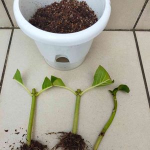 6月にあじさいの挿し木をしました。 今日様子を確認しましたら、2本は根っこが生えていて良かったぁ(*˘︶˘*).。.:*♡