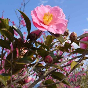 花梅を背景にピンクの山茶花が凛と咲いています🌸💕✨ 畑の片隅ですが、この空間だけはピンクで溢れてます‼️💐😆 癒やされました〜🐰