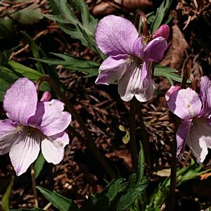 雨あがりに行ってきました♪ エイザンスミレ(叡山菫) スミレ科 スミレ属 多年草 本州、四国、九州に分布。 山地の林下、林縁に生育。 葉は3深裂し、各裂片に柄がある。柄の基部から少し離れたところで、更に深裂し、鳥足状になる。 花は白〜淡紫色など変化が多い。 側弁基部に毛がある。花弁の縁が波打つものが多い。 花柱の上部はカマキリの頭形。 距は太い。 花期4〜5月 3月28日撮影 福島県南部