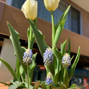ムスカリと白チューリップがコラボレーションできました🎉ムスカリの下の方が枯れかけてますが、なんとかチューリップが間に合いました😊 普通の格安チューリップでしたが、ほんのりクリーム色でかわいい!来年はたくさん植えたいと思いました❤️