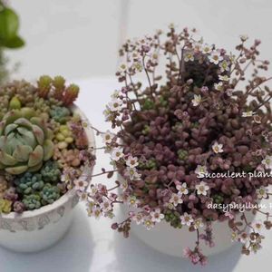 5/26(日) 10-18 営業です。 本日は、店主は12時頃から外出しています。 ちまちま屋産の新入荷苗です。 ★白牡丹 3号 500円 4点 セデベリア属の、と~っても丈夫な種類です。 こういうロゼットの多肉の中では、増えやすさNo.1と言っていいかと。 葉挿し率ほぼ100%、カットしたらたくさん子吹きますし、成長スピードも速いです。 暑さ寒さにも強く、ロゼットがキレイなので寄せ植えにも使いやすいです。 このポットにも、これでもか!ってくらい葉挿しを隙間にたくさん入れてあります(笑) ただ、ある日突然バラバラ事件(ジュレて葉がばらけること)を起こすことがありますが… また葉挿しも出ますので、あまり気にしなくて大丈夫です。 ★エンジェルティアーズ 400円 1点 ピーチネックレスの斑入り種…、とよく言われていますが、実は「アーモンドネックレス」の仲間です。 これも斑入りのはずなのですが、少し斑が薄いのでこのお値段で。 少しデリケートなグリーンネックレスと違い、こちらは丈夫です! 日差しに当ててもほとんど問題ないので、寄せ植えにも入れやすいです。 ただ、カット挿しは根付くまで少し時間がかかるようなので、急に強い日差しには当てないように注意してください。 ★アーモンドネックレス 500円 1点 ぷっくらとしたつぶつぶが可愛いですよね。まさに「アーモンド」っぽいです。 暑さ寒さに強い強健種で、ちまちま屋のテーブルの上にある「雨ざらし日ざらし寄せ植え」でも元気にしています。 「つる」が太くて弾力があるので、大き目の寄せ植えに使うといい感じです。
