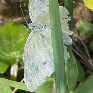 モンシロチョウ シロチョウ科モンシロチョウ属 スイセンの葉に止まるモンシロチョウ。翅が薄くてぼろぼろです。