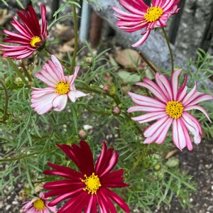 こんにちは😃 ①ヒョロヒョロのくきなんですが色鮮やかになりピエールの落ち葉🍂の間からコスモスが🌸風に揺れています🌸 ②通勤途中の花壇 リフレッシュされてモルタルのえんぴつくん?家かな?愛嬌あり笑ってしまいました ③去年採取したスィトピーの種🌱から🌱発芽率ほぼ100%❣️寒い冬乗り切れるかな🌸