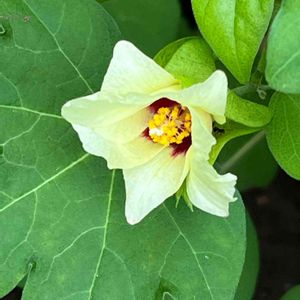 おはようございます☀ 綿の花が咲きました! 5月に民芸の森でいただいた茶綿の種を 播いたものです。