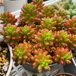 先日投稿した暴れん坊虹の玉はホームセンター出身で培養土?だからみどりんなのかな? こちらはメルカリでカットをお迎えして鹿沼土に植え付けたから?まだ赤いです🥰 多肉は環境で姿が変わるのが面白いです🤗
