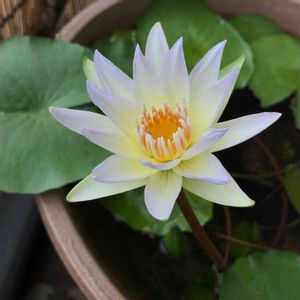熱帯睡蓮 一般種 ムーンビーム。 うまく撮れていませんが、中央から黄色が広がり縁に薄く藤色が入ります。