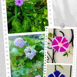 ❶我が家の植物達🌿 ❷挿し穂で地植えしたルエリアパープルシャワーが咲きました ❸四季咲き紫陽花 霧島の恵とガーデンシクラメンの共演🪴 ❹❺ミニ花壇の昼顔の富士の紅と富士の空が咲き出しました