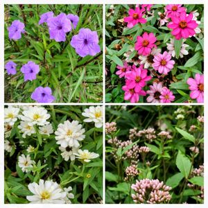 今朝のお花たち💜🌸🤍 涼しくなって、いろんな夏の花がもりもり綺麗😄 右下のはフジバカマの 2色(奥に白)ですが つぶつぶのつぼみが可愛いです🤗 全部咲いたら🦋🫧 アサギマダラが来てくれるのかなー🤗