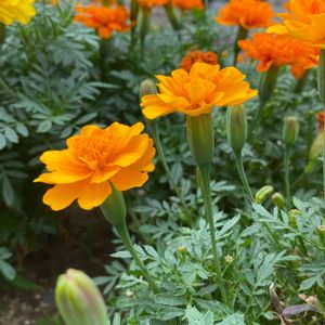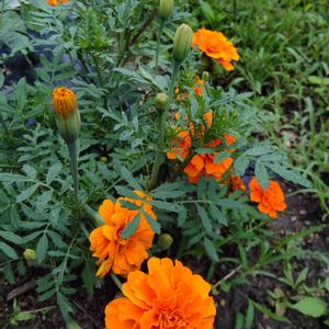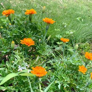 切り花向きのマリーゴールドが 咲き始めました 現在私の腰ほどの高さに成長してます 8月お盆のお墓参りに重宝してます これから次から次と 咲いてくれるでしょう✨