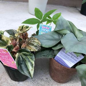 今日園芸店に行った目的はペペロミアピンクレディ💕まだ残ってた〜✨ 先日行った時はオルモストシルバーは見なかったけど、見つけちゃったのでお持ち帰り☺️ 実生のパキラも欲しかったしいいお買い物できた❤️