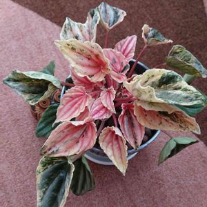 先日一目惚れして買ったコ。 ペペロミアニューピンクレディーと 言う名前らしいです。 下葉のスイカのような葉と、 上のサーモンピンクの斑入り葉が なんとも豪華です。