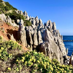 ⚪️白い石灰岩のカルスト 🔴剥き出しになった赤土 🔵青く澄み渡った空と海 🟡土手一面に咲くアゼトウナ𖡼.𖤣𖥧𖡼.𖤣𖥧 昨日は 小説「潮騒」の舞台である 三重県の神島に 弾丸ソロトリップに行ってきました。 同映画のロケ地にもなった島だそうです。🎦 行きの車内で潮騒📘を読み終え🚞 鳥羽港から高速船で40分かけて島に渡る。⛴️ この日に限って風速7m🌬️ 揺れる揺れる🌊😱 島に着くと インバウンドどころか 観光客も私だけ。 時代から取り残されたような不思議な離島🏝️ 島民の生活道路を通り 名所を結ぶ遊歩道へ向かう。(名前は遊歩道だけど急な坂や階段だらけで、ほぼ登山⛰️) 歩道沿いに咲く野生の花達𖡼.𖤣𖥧𖡼.𖤣𖥧 野生のツワブキ2️⃣ ツリガネニンジン?3️⃣ ノアザミ4️⃣にはアサギマダラが飛来するそうで、遊歩道に生えたのも刈らずに残してあるそうです。 思ったより険しい道が多いし、浜に降りる階段も狭くて急で手すりもない😱 こういう所で育つ子供達は、逞しくなるでしょうねー。 写真を撮ったり浜辺で貝を拾ったりしてたら 最終便⛴️の時間が近くなり、道にも迷ったのもあり 最後の800メートルくらいは喉から血が出るくらい走りました。🤮 観光情報もあまりないけど、いつかみどりのまとめにしたいくらい、すごく魅力的な島でした。 ========== GSもご無沙汰です。 1カ月ほど前から、ちょいと勉強し始めたことがありまして(資格とかではないんですが)それがなかなか頭に入らず…😵💫一つのことを覚えるのにすごーく時間がかかるので、SNSから遠のいておりました。 またボチボチ復帰していきますね (* u.u)) ペコリッ