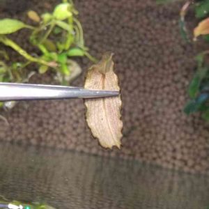 画像はブセファランドラ クダガンの溶けた葉です。 付け根から溶けてしまうのはこれで2枚目なので、この葉だけが弱っていたというわけではなさそうです…。 私の水槽になにが起こっているのでしょうか…。 肥料不足または過剰の症状でしょうか? 肥料はイニシャルスティックを埋めていますが、ソイルを厚めに敷いております。 まったくわかりません。助けてください!