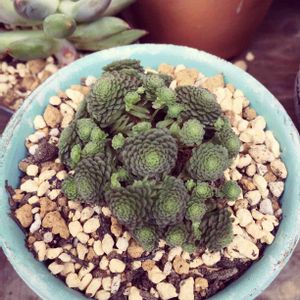 モナンテス ポリフィラ。ひとまわり大きい鉢にいたのだけれど、あふれて反対側に気根がいっぱいだったから、一部カットして植え直したの。増えそうだなぁ〜。アンテナ交信と言われている開花の時期がお楽しみ。