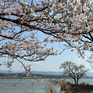 白山はもやでうっすら。 一周6.4キロの遊歩道をゆっくり歩きました。 対岸には千本桜といって遊歩道の両側に桜並木が続いています🌸