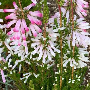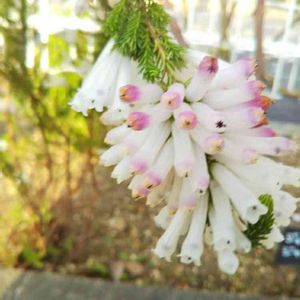 おはようございます😃 エリカの花です。 昔から知っているジャノメエリカよりも細長い花です。😊 透明感のある花には目を奪われます。 柔らかな針葉樹のような葉っぱ。 枝を包むように咲く細いロート状の花。 今にも、先から雫が垂れそうです。😊 せいぜい、1.2mの灌木ですが、私は屋根より高い木を見たことがあります。🤔 英名、ヒース。 小説『嵐が丘』の荒涼としたヒースの丘に咲く花です。 自然環境の厳しい丘で育つのですから、きっと丈夫な木なのでしょう。