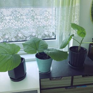今日は雲が多く柔らかい日差しです(*´꒳`*) ハダニチェックをしていたら、ウンベラーダの葉に2、3匹ずつくっついていたので外に出して潰して霧吹き三昧(*´-`) この二重底の陶器鉢は、ずっと前に鉢欲しさで買ったパキラかな?の物でした。 反対側から見たら普通の鉢に見えるでしょ?(๑˃̵ᴗ˂̵)💕 パキラは育ったので、ひとまわり大きい鉢に変えました☺️