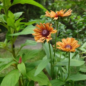 ルドベキア キャラメルミックス 雨上がりの今朝の様子。 去年のお花は(矮化剤で引っ込んだ所に咲いていて)よく見えなかった😭のですが、今年は40cm程に伸びて可愛く咲いてくれました。