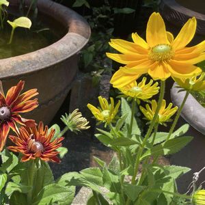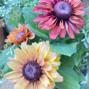 久しぶりに文京区の園芸店 音の葉に行ってきました😊 もうペチュニア系はほとんど無く、ルドベキア、エキセアナ、ニチニチソウがメインになっていました❣️ 私の大好きなPWのルドベキア アーバンサファリがあったのですが、立派な株で1480円。ちと高いと思い、泣く泣くパスしました😥 代わりにルドベキア キャラメルミックスをゲット。アンティークカラーの色んな色が一度に楽しめます💕 PWのユーフォルビアダイヤモンドフロスト、ピンク色の千日紅も連れ帰り、寄植えを作りました。 三つ買ってもアーバンサファリよりもお安いのでコスパ良しの寄植えになりました😍