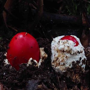 タマゴタケ🍄が顔を出しました。白い殻から顔を出した姿は中々キュート。 食べても美味しそうですが、勇気がいります💦