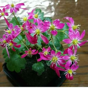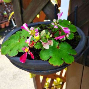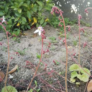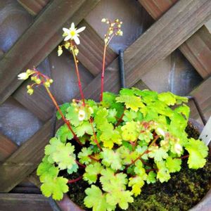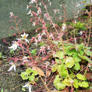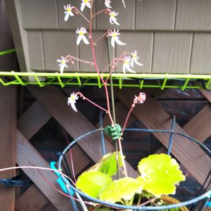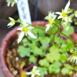 昨年の秋に、母ちゃんの実家に行く途中の大手HCで、ユキノシタ「御所車 売れ残り100円」名前に惚れ購入しました。秋咲きと思い購入したが、春咲きでした。この地域は風が強く、御所車の名前だから京都生まれ?副え木や止め物で補強して風の来ない駐車場に移動して満開になりました。