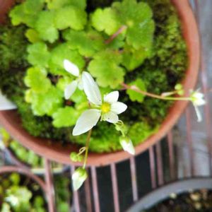 ユキノシタ、やっと数輪咲き始めました。朝から昼間で日が当たります。花は全部東から南向きに顔向けてます。一輪だけ南向きの花をパチリと撮りました。小まい花は難しいな‼️