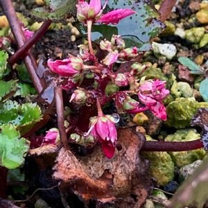 <自道投稿>少し冷えた朝😊大文字草「大宇宙2」です✨葉を二枚反対にして撮影しました。赤く沢山の星に見えます。名前の雄大さ🤩に負け購入三年目🎵来春株分けします😃一種二鉢・二個まで🤔😣😞