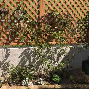 バラの現在。ピエールさんは少しフェンスに伸ばしていますが、茎が細いから花付くのかと今から心配…。バラ初心者すぎてどう育てていけばよいのかイマイチわからない😇向かって左はプリンセスオブインフィニティ、真ん中がブルームーン、右がピエールドゥロンサールです。