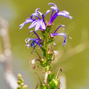 サワギキョウですね。シデシャジンと間違いそうですが下唇が3裂します😍 シデシャジンは、花弁も萼も全部が線形です。 キキョウ科ミゾカクシ属なんで花はミゾカクシによく似ています。 もう枯れかかってますねえ、本当は湿原の秋に似合う花のはずなんですけどねえ…