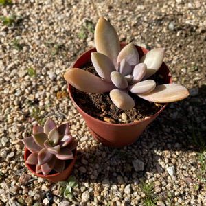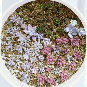 整ってない多肉をやっと寄せてみた( ´_ゝ`) 姫秀麗は葉がポロポロ取れやすくて、 冬の…突風で取れたのを…素焼きの受け皿に入れっぱなし、それでも芽が出ていて…どうしようかと持て余していたものと繁殖鉢も解体して長めの茎切って挿した。 ブロンズ姫はコメリで徒長したものを…買って葉挿しから育てたもの。 セルトレイだから小ささ保って可愛らしい( ´_ゝ`) 専門店の虹の玉、ほかの寄せ植えに参加させ、繁殖鉢だけと窮屈そう…。 これも茎切って挿した\(´ω` )/ 姫秀麗とブロンズ姫の2種類だけなら交わるように植えても綺麗だっただろうけど虹の玉も入れるので三分割に…。 行き場の迷い子な月花美人と秀麗と天使の雫も…(σ´Д`)σ もいでたビアポップも根っこ出てるんだけどもう入らない(ノ∀`)ペシッ