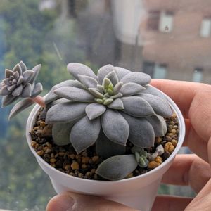【エケベリア属 カルニコロル・カルニコロール】 Echeveria carnicolor 和名 銀明色 別名 銀明水・カルニカラー (原種) ネームタグは【銀名色】と🏷 検索すると、葉の色が、 画像のような紫寄りとは異なり、 シルバー寄りのものも出て参ります 【羽兼直行】さんの著書では、 このように記載されてみえました 「日本で流通している銀明色は紫色のものが多く、名前のような銀色は少ない グリステンの輝きをもち、逆光で葉が光る」 因みに「グリステン」とは何ぞや? と翻訳サイトにかけたら 「glisten」 🇺🇸動詞 濡れているように光る 🇺🇸名詞 輝き・きらめき …だそうです メモメモ_φ(・_・ 脱線しましたが、葉っぱの質感は 鮫肌と言うより猫の舌(ΦωΦ) カクト・ロコさんの1寸苗 http://cactoloco.jp/dic/A288.html