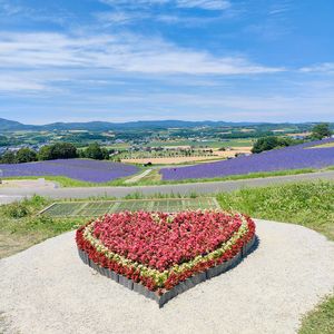 ハートマークの花壇とラベンダー畑 遠くには上富良野の街並みも見えます