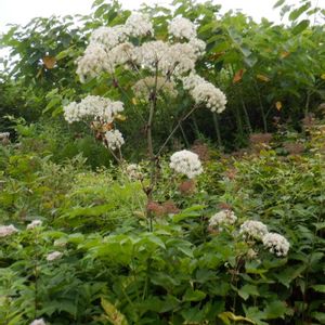 ミヤマシシウド(深山猪独活)セリ科シシウド属 駐車場に私の背丈ほどの大きなお花が咲いてます。 ミヤマシシウドのようです。 シシウドの変種。 丈は0.5-1.5mほど、葉は2-3回3出羽状複葉で、小葉は長く6-15cmで先が尖り、葉裏や茎にはほとんど毛が見られません。 花は大きな複散形花序に付き、小花序は球形、総苞片、小苞片ともにない。 シシウドは丈が1-2m、葉は全体に少し小さく、葉裏や茎に毛が見られ、小葉は長さがやや短い。 🏷️ 白い貴婦人✨